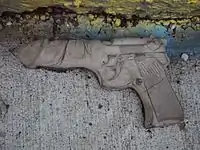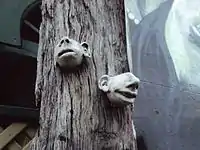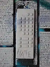 - The concrete graffiti style uses objects cast in concrete or a similar material, which are often glued into place on a footpath or against a wall. Around Newtown, many of these objects appear to have been created by the same artist, Will Coles, as a commentary on consumer culture. They have often been in the form of familiar items such as televisions and TV remote controls, and feature inscribed single-word slogans such as "fear" or "hate". These largest of these objects are the installations on King St. and on the corner of Gladstone St., Enmore; both are full-scale replicas of a medium-size CRT television mounted on top of a replica VCR. The King St. object (now defaced by marker tags) is inscribed with the slogan "life is fleeting" and the Gladstone St. object with the word "obsolescence". Other concrete graffiti objects (such as those pictured above in May St., St. Peters) are partial representations of human-like faces, which appear to be based on medieval gargoyles.[14][15]