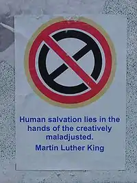 The "I Have a Dream" (Martin Luther King) mural, painted over two nights in August 1991, is the largest, most prominent, and the longest-surviving of the many large format murals created around Newtown by the team known as Unmitigated Audacity Productions, the core members of which were New Zealand-born Canadian artist Andrew Aiken and his colleague Juilee Pryor. They were assisted in this mural by Tony Spanos, who provided a cherry-picker to allow the upper part of the mural to be painted.[7] It commemorates American civil rights leader Dr Martin Luther King Jr. One of the last surviving large-format murals in the area, it displays a large portrait of Dr King, next to a large painted depiction of the Apollo 8 photograph of the Earth from space, and quotes Dr King's 1963 "I Have a Dream" in large Gothic lettering, near which is the quotation from Genesis 37:19: "Behold the dreamer cometh; Come now therefore and let us slay him, and we shall see what will become of his dreams".