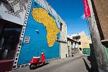 The "Africa" mural in King St. was originally painted in the early 1990s. The large work occupies the entire side wall of an African restaurant, located between the Newtown Mission and the Commonwealth Bank. The first version was reproduced from an old map printed by the Australian firm Chas. Scally & Co., most likely dating from the 1960s. The current version, painted over the original in the early 2000s, reflects the major changes in African political geography in the recent times.