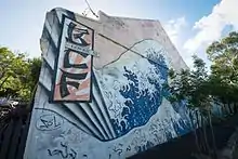 One of the largest and longest-lasting Newtown murals is the "Great Wave" mural, painted on the side of a house located at the corner of Munni St. and Gowrie St. in south Newtown. Created in 2000, it features a striking combination of elaborate 3D style abstract pieces and pictorial images on a Japanese theme, including a huge image of a breaking wave rendered in the style of the famous Hokusai woodcut The Great Wave Off Kanagawa. The work is credited to artists "DAYS", "DMOTE", "PUDL" and "SNARL", members of the street art collective "Big City Freaks" (BCF), whose initials can be seen on the far right of the Great Wave mural. In October 2009 members of this group rendered a new mural along the rear wall of the Ausscrap building, facing Wilford St.