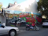 The "Big City Freaks" street art collective, founded in 1998, includes the artists DMOTE, PUDL, SNARL, SKULL McMURPHY (Troy Edwards), SET and ZEN (aka SKOTE STYLES). The group has executed several large-format murals and other works in the distinctive "blended" style, combining highly stylized tags and striking graphic elements such as monsters, aliens, robots, skulls and designs sourced from Japanese art. Probably the most popular and currently the longest-surviving example of their collective work is the "Great Wave" mural. The group has its own website, where images of many of the group's works can be seen. One of BCF's most recent works is a large-format mural, created in late October 2009 on the rear wall of the Ausscrap Building, facing Wilford St, Enmore.[9]