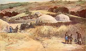 Most of what is believed about ancient Nguni history comes from oral history and legends. Traditionally, their partial ancestors are said to have migrated to Africa's Great Lakes region from the north.[3] According to linguistic evidence and historians (including John H. Robertson, Rebecca Bradley, T. Russel, Fabio Silva and James Steele), what would be some of the ancestors of the Nguni people migrated from west of the geographic centre of Africa[4] towards modern-day South Africa 7000 years ago (5000 BC).[5][6][7][8] Nguni ancestors had migrated within South Africa to KwaZulu-Natal by the 1st century AD, and were also present in the Transvaal region at the same time.[9][10][11][12] These partially nomadic ancestors of modern Nguni people brought with them sheep, cattle, goats and horticultural crops, many of which had never been used in South Africa at that time.[13][10]