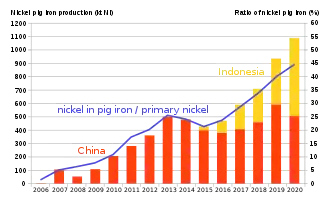 Nickel pig iron is made of low-grade nickel ore, coking coal, and a mixture of gravel and sand as an aggregate. This mixture is heated in either a blast furnace or an electric arc furnace depending on the desired grade. Impurities are then removed via smelting and sintering processes and the resulting nickel pig iron contains four to 13 percent pure nickel. According to the Canadian city of Sudbury, nickel pig iron equals "dirty nickel" because the production process is not environmentally friendly, the carbon dioxide emissions being particularly high. China had imported most of the nickel containing ore from Indonesia and the Philippines, but as of Jan 2014, Indonesia has banned the export of ore. China imported 53 percent of the nickel ore from Indonesia in 2011.