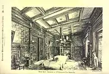 The Nickerson House was designed by one Chicago's earliest prominent architects, Edward J. Burling (1819–1892) of Burling and Whitehouse.[3] In addition, three decorators were contracted for the interiors: William August Fiedler (1843–1903) and R. W. Bates & Co. of Chicago, and New York-based George A. Schastey & Co. The three-story, 24,000 square-foot Nickerson House was reported to be the largest and most extravagant private residence in Chicago at the time of its completion. (This distinction would be transferred to the Palmer Mansion on the Gold Coast several years later.) Nickerson spared no expense, spending $450,000 on the construction and decoration of his home.[4]