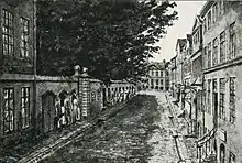 The short section from Valkendorfsgade to Gråbrødretorv (Løvgade) was called Tugthusporten (Jailhouse Gate) after a children's jail established at the site by Christian IV but soon moved to Christianshavn (see Women's Prison, Christianshavn).[2] It was a narrow, vaulted passageway which ran through a building. The building had six window bays along the square and two window bays across the street.[3]