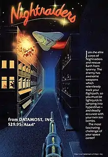 Nightraiders is a scrolling shooter designed by Peter Filiberti and published in 1983 by Datamost for the Atari 8-bit home computer.[1] The game is heavily inspired by the 1982 Sega arcade game Zaxxon.