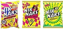 NikNaks, also known as "amaNikNaks,"[1] is the brand name for a popular[2] brand of South African Cheese puffs manufactured by the Simba Chips company since 1972.[3] Originally only coming in a "Cheese" flavour. It's normally sold in 55 gram and 135 gram bags. And is primarily made from maize, vegetable oil, salt and cheese.