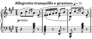 The Second, Third and Fourth piano sonatas are unrelated one-movement works. They were written during the period 1904–07 and published as the "Sonata-Triad", Op. 11. The first of the trio, in A, is an ecstatic work with attractive, lyrical themes, prefaced by a poem by Goethe.[12] The second, in D minor, is entitled "Sonate-Elegie". It opens slowly with one of Medtner's best-known themes and closes with an animated coda (Allegro molto doppio movimento, in D major) based on the second subject. The third, in C, returns to the lyricism of the first.