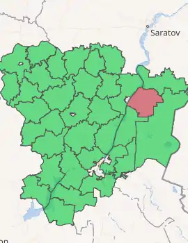 Nikolayevsky District (Russian: Никола́евский райо́н) is an administrative district (raion), one of the thirty-three in Volgograd Oblast, Russia.[1] As a municipal division, it is incorporated as Nikolayevsky Municipal District.[5] It is located in the northeast of the oblast. The area of the district is 3,440 square kilometers (1,330 sq mi). Its administrative center is the town of Nikolayevsk.[2] Population: 32,034 (2010 Census);[3] 34,285 (2002 Census);[7] 35,145 (1989 Census).[8] The population of Nikolayevsk accounts for 47.1% of the district's total population.[3]