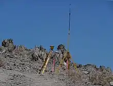 A fumarole field is associated with the Salton Buttes.[2] The field is characterized by gryphons[lower-alpha 1] and salses.[lower-alpha 2] These exhale carbon dioxide and steam, as well as ammonia and hydrogen sulfide. Some of these fumarolic vents reach heights of 2 m (6.6 ft), and resemble the lava-erupting vents. Mud pots are also found.[22] Parts of the field have recently emerged from the Salton Sea, due to dropping water levels,[23] which have also caused the fumarolic vents to develop and grow noticeably,[24] including an increased number of gryphons.[25]