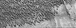 Nili Patera is a dune field on Mars. It is located on top of a lava bed, at the site of an ancient volcano, the Nili Patera caldera of Syrtis Major, near the Martian equator,[1] and it is one of the most active dune fields of Mars. Its location coordinates on Mars are 8.7° N latitude, 67.3° E longitude.[2] It is being actively studied by the HiRISE camera, on board the Mars Reconnaissance Orbiter, at the rate of one image every six weeks. The study of the movement of the dunes provides information regarding wind variation as a function of time and furthers the study of surface erosion characteristics of the Martian landscape. This information can then be used for the development and design of future Mars expeditions.[1][3] The dunes of the Patera field are of the barchan type and their study by HiRISE was the first one to establish dune and ripple movement of a minimum of 1 metre (3 ft 3 in) on Mars.[4] The Patera dune field, was also the first to be investigated using the COSI-Corr software, which was originally developed to analyse the movement of earthbound dunes.[4] The research results from the evidence provided by the monitoring of the Nili Patera field, indicate sand fluxes of the order of several cubic metres per metre per year, similar to the flux observed at the sand dunes of Victoria Valley in Antarctica.[5]