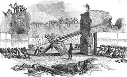 A member of ISIL filmed the destruction, declaring, "These ruins that are behind me, they are idols and statues that people in the past used to worship instead of Allah. The Prophet Muhammad took down idols with his bare hands when he went into Mecca. We were ordered by our prophet to take down idols and destroy them, and the companions of the prophet did this after this time, when they conquered countries."[44] ISIL declared an intention to destroy the restored city gates in Nineveh.[42] ISIL went on to do demolition work at the later Parthian ruined city of Hatra.[45][46] On April 12 2015, an on-line militant video purportedly showed ISIL militants hammering, bulldozing and ultimately using explosive to blow up parts of Nimrud.[47][48]