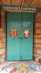 The consort of Ninra Narayana, Aruna Mahadevi (also called "Shenbagavalli") has a separate shrine in the second tier. The Utsavar (festival image) of Arunakamala Mahadevi is called Shenbagavalli and is housed inside the same shrine. Unlike other temples, the image of Thayar is seen in standing posture. All poojas are first performed to Thayar before being done for the presiding deity. The second tier houses the four-pillared hall, vehicle hall and mirror room. A cave temple on the lower tier, bearing the traces of Pandyan art, is located to the West of Kalyana Mandap. The image of Pallikonda Perumal is housed in the cave, with Sridevi and Bhudevi serving his feet and sages Markandeya and Bhrigu occupying prominent places on either side.[1] The rectangular walls around the temple enclose all the shrines and water bodies associated with the temple. The rajagopuram, the main gateway tower, has a flat structure, compared to other South Indian temples that have a steep structure.[1]