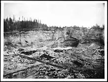 The Nisenan were initially unaffected by European-American influence and their initial meeting with the Spanish and U.S. expeditions were peaceful in the early nineteenth century. In 1833, a severe malaria epidemic hit which killed many of the Nisenan as well as other neighboring tribes. The 1849 Gold Rush led to the appropriation of their land, decimation of their resources, more disease, violence, and mass murder.[6] The influx of migrants created by the Gold Rush and their excessive use of the land caused a strain on the environment; this prompted a drought and starvation took over.[7] The Nisenan population dropped from approximately 9,000 to 2,500 people by 1895 and a fraction of the surviving Nisenan were left in the Sierra Nevada foothills and acquired low-wage jobs.[6]