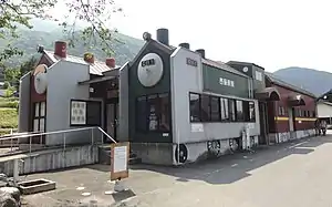 Nishi-Fujiwara Station has a single island platform; however, one side of the platform is used to display three old locomotives, and is not in use. The station building is designed to resemble a steam locomotive.