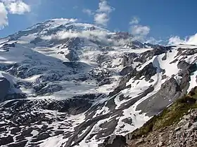 The Nisqually Glacier is one of the larger glaciers on the southwestern face of Mount Rainier in the U.S. state of Washington. The glacier is one of the most easily viewed on the mountain, and is accessible from the Paradise visitor facilities in Mount Rainier National Park. The glacier has had periods of advance and retreat since 1850 when it was much more extensive. It is currently retreating.[1] Measurements made at 9,200 feet (2,800 m) altitude show that glacier got 56 ft (17 m) thicker between 1994 and 1997, suggesting that it will probably begin advancing in the first decade of the 21st century.[2] Nisqually Glacier is the source of the Nisqually River.[1]