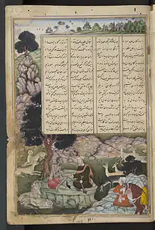 A story of pre-Islamic[28] Persian origin which is found in the great epico-historical poems of Shahnameh and is based on a true story that was further romanticized by Persian poets.[43] The story chosen by Nezami, was commissioned and dedicated to the Seljuk Sultan Toghril II, the Atabek Muhammad ibn Eldiguz Jahan Pahlavan and his brother Qizil Arslan. It contains about 6,500 distichs in length, the story depicts the love of Sassanian Khosrow II Parviz towards his Armenian[44] princess Shirin. Khusrow and Shirin recounts the story of King Khosrow's courtship of Princess Shirin, and the vanquishing of his love-rival, Farhad.[45] The story has a complex structure with several genres exploited simultaneously; and contains many verbal exchanges and letters, all imbued with lyrical intensity.[10] Khosrow endures long journeys, physical and spiritual, before returning to Shirin, his true love.[10] They are eventually married, but finally Khosrow is killed by his son and Shirin commits suicide over the body of her murdered husband.[10] Pure and selfless love is represented here embodied in the figure of Farhad, secretly in love with Shirin, who falls victim to the king's ire and jealousy.[10]
