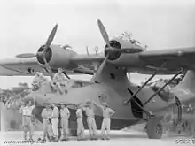 A No. 111 Flight crew with a Catalina in early 1945. The captain, Flight Lieutenant I. J. L. Wood (left), was awarded a DFC for rescuing a US air crew from enemy-controlled waters during 1944.