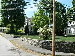 Nobility Hill is roughly defined as a rectangular area bounded on the north and west by Cedar Avenue, on the south by Maple Street, and on the east by Chestnut Street. The area is located a few blocks west of Main Street and Stoneham's Central Square. Maple and Chestnut Streets are both roads laid out early in the 19th century as through streets. The early significant development in this area was made by some of Stoneham's wealthiest residents (thus giving it its name), notably John Hill and H. H. Mawhinney, both owners of shoe factories, and C. W. Tidd, owner of the Tidd Tannery. The land that made up Hill's estate stands outside the district, on the south side of Maple Street, while Mawhinney's was located on the east side of Chestnut Street, where several houses now stand within the district. The Tidd estate was located in the area mostly occupied by Cedar Avenue and Poplar Street. Neither the Tidd nor Mawhinney estate houses survive, although stone walls and a gate survive from Tidd's, incongruously set in front of mid-20th century ranch houses.[2]