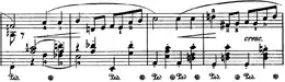 A tempo change to più mosso speeds up the piece. It starts off with some fast, triplet quavers and then three loud (forte) chords. This then repeats three further times until a completely new section comes in with a melody in the right hand and triplet broken chords in the left (see score on right). A descending scale and some large chords completes this section and leads it onto the first theme again.