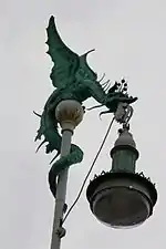 The place where the royal challup lands is also flanked by two street lights topped by dragon figures which hold the fixtures. One of the dragons has red eyes. They were designed by Vilhelm Dahlerup and installed in 1892.