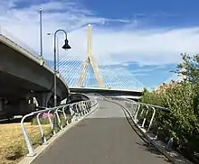 ![]() The western end of the bridge as it enters North Point Park; the Leonard P. Zakim Bunker Hill Memorial Bridge is visible in the background (2016) | |