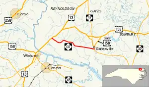 North Carolina Highway 137 (NC 137) is a 8.6-mile-long (13.8 km) highway entirely in Gates County, North Carolina. NC 137 runs from NC 37 in Gatesville to US Highway 13/US Highway 158 (US 13/US 158) north of Winton.