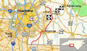 NC 200 traverses 50.1 miles (80.6 km), starting at the South Carolina state line, through the city of Monroe, and the towns of Stanfield and Locust, before ending at US 601 near Concord. For its length, it is a two-lane rural highway except in Monroe where it is a four-lane road from Charlotte Avenue to US 74 and a six-lane divided highway on its concurrency with US 74 and US 601.[1]