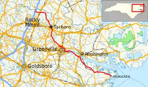 North Carolina Highway 33 (NC 33) is a primary state highway in the U.S. state of North Carolina. Spanning a distance of 110 miles (180 km), the east–west route passes through many small towns and communities in Eastern North Carolina's Inner Banks. It bypasses a large portion of the cities of Rocky Mount and Greenville, and goes through central Tarboro.