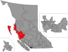 As of the 2020 provincial election, North Coast comprises the entire area of the Skeena-Queen Charlotte and Central Coast Regional Districts and the southern portion of the Regional District of Kitimat-Stikine, located in the central and northern coast of British Columbia, Haida Gwaii and other islands. Communities in the electoral district consist of Prince Rupert, Bella Coola, Bella Bella, Queen Charlotte, Masset, Port Edward, Klemtu and Port Clements.[1]