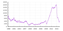 The North Dakota oil boom refers to the period of rapidly expanding oil extraction from the Bakken formation in the state of North Dakota that lasted from the discovery of Parshall Oil Field in 2006, and peaked in 2012,[1][2] but with substantially less growth noted since 2015 due to a global decline in oil prices.[3] Despite the Great Recession, the oil boom resulted in enough jobs to provide North Dakota with the lowest unemployment rate in the United States from 2008 to at least 2014.[4][5] The boom gave North Dakota, a state with a 2013 population of about 725,000, a billion-dollar budget surplus. North Dakota, which ranked 38th in per capita gross domestic product (GDP) in 2001, rose steadily with the Bakken boom, and had a per capita GDP 29% above the national average by 2013.[6]