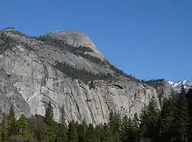 North Dome is a granite dome in Yosemite National Park, California. It is the southernmost summit of Indian Ridge, 0.6 miles (1.0 km) north of Washington Column and the Royal Arches on the northeastern wall of Yosemite Valley. It can be reached by trail from the Tioga Pass Road, or by going up the Yosemite Falls trail and heading east. It can also be reached from Mirror Lakes by the Snow Creek Falls trail going north around Indian Rock and then south again on the Tioga Pass Road trail. The South Face is precipitous.[3]