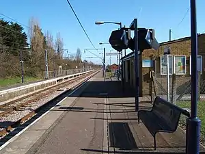 The line and station were opened for goods on 1 June 1889 and to passenger services on 1 October 1889 by the Great Eastern Railway. Facilities then included two platforms, both provided with buildings and linked by a footbridge; a goods yard including cattle pens; and a 30-lever signal box, reduced to 10 after 1966.[2] The signal box was taken out of use on 1 December 1985 and demolished in February 1986. The original footbridge was replaced with a higher one prior to the electrification of the line in 1986.[2] Electrification using 25 kV overhead line electrification (OLE) was completed on 12 May 1986.