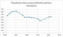 Yet, this successful industry faced competition from high volume machinery located in 'textile towns'.[8] As a result, North Lopham's last production of linen was in 1910. In 1831, the parish had a population of 807[9] and contained a total of 121 houses.[10] Within North Lopham, there are a total of seventeen properties which are on the National Heritage List including the grade one listed St. Nicholas's church and the grade two listed Wesleyen Chapel.[11] In 1834, North Lopham became part of the Guiltcross Union which consisted of a total of eleven workhouses within Wayland, Thetford and Depwade.[12] A work house was erected in North Lopham in 1836.[13] In 1881, the main industry of the parish was agriculture, with 29% of the population of 674 working within this sector.[14] Census data for the parish dates back to 1801, with the earliest figure for population being 588.[15] The population decreased from 832 in 1851 to 461 in 1961.The population was at its lowest in parish history in 1961. The overall trend for the parish population is a gradual decrease until 1961, followed by an increase to 668 in 2019.