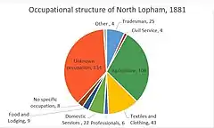 The occupational structure of North Lopham as of 2011 has seen reductions in the percentage of individuals working within the agricultural sector: only three percent of 623 people. The 2011 census shows that the industrial sector which employs the most residents of North Lopham is: 'Wholesale and Retail Trade; Repair of Motor Vehicles and Motor Cycles'. This industry employs eight percent of the population of the parish (16% of the working population).[16]
