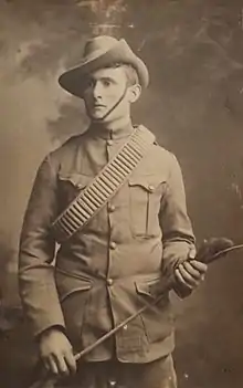 The North Somerset Yeomanry raised the 48th (North Somerset) Company for the IY, which arrived in South Africa on 23 March 1900 and served in 7th Battalion, IY.[3][4][20][22][23][24] The company served until 1901, earning the regiment its first Battle honour: South Africa 1900–01.[4][11][25] The regiment's CO, Viscount Dungarvan was already serving in South Africa in February 1900 and was seconded to the IY as second-in-command of the 22nd Battalion in 1901–02.[26][27][28][29]