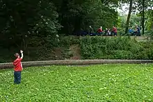 Bradford Model Engineering Society operate two railway tracks in the woodland area of the park. The gauges vary between 3.25 inches (83 mm) and 5 inches (130 mm) on a raised oval track that runs for 440 feet (130 m) and a larger loop that runs on the ground for 2,000 feet (610 m) and takes trains of 5-inch (130 mm) and 7.25-inch (184 mm) gauges.[21] The society is one of the oldest model engineering societies in Britain (founded in 1908) and operates the railways in summer for passengers weather permitting.[22] The society refer to, and label their railway, as Northcliff Railway using one of the older spellings of the name.[21]