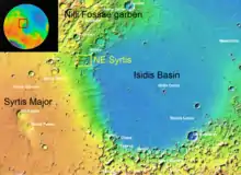 Northeast Syrtis is a region of Mars once considered by NASA as a landing site for the Mars 2020 rover mission.[1] This landing site failed in the competition with Jezero crater, another landing site dozens of kilometers away from Northeast Syrtis.[2] It is located in the northern hemisphere of Mars at coordinates 18°N,77°E in the northeastern part of the Syrtis Major volcanic province, within the ring structure of Isidis impact basin as well. This region contains diverse morphological features and minerals, indicating that water once flowed here.[3][4][5][6][7][8] It may be an ancient habitable environment; microbes could have developed and thrived here.