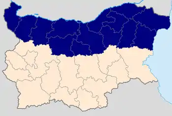 Northern Bulgaria (Bulgarian: Северна България, romanized: Severna Bylgarija), also called Moesia (Bulgarian: Мизия, Mizija) is the northern half of Bulgaria, located to the north of the main ridge of the Balkan Mountains which conventionally separates the country into a northern and a southern part. Besides the Balkan Mountains, Northern Bulgaria borders the Timok River and Serbia to the west, the Danube River and Romania to the north and the Bulgarian Black Sea Coast to the east.