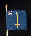 The command flag of the commanding officer of the Northern Military District is drawn by Kristina Holmgård-Åkerberg and embroidered by hand in insertion technique by the company Libraria. Blazon: "On blue cloth an erect yellow sword; in the first corner a white reindeer at speed armed red, followed by a white mullet".[9]