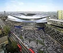In November 2007, it was reported that the club was considering the building of a new 52,000-capacity stadium, to be masterminded by Tony Winterbottom, formerly of the London Development Agency, who had worked on development of Arsenal's Emirates Stadium.[28] In this plan the club would leave White Hart Lane for two seasons, possibly sharing ground with West Ham.[29] In October 2008, the club announced that it was planning for the Northumberland Development Project with a 60,000-capacity stadium.[30] In December 2008, images for the new stadium were released,[31] followed by plans for the project with a 58,000-capacity stadium in April 2009 for public consultation.[32] In this plan, the new stadium would be built alongside the existing White Hart Lane.[31] The stadium was designed by KSS Design Group, While the project masterplan was by Make Architects and it contained a public square and two amphitheatres designed by Martha Schwartz Partners, with Buro Happold responsible for the engineering and technical aspects of the build.[33][34] In October 2009, planning application for a 56,000-seat stadium including proposal for 434 new homes, a 150-room hotel, a club museum and shop, and a supermarket was submitted, with a view to start construction in 2010.[35] However, the plan to demolish eight locally listed buildings and two nationally listed buildings was criticised by English Heritage, and the Government's advisory body on architecture, the Commission for Architecture and the Built Environment, as well as other conservation groups.[36][37][38]