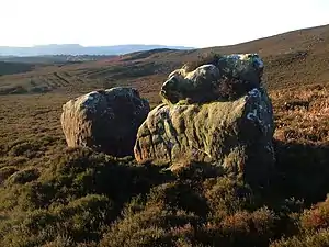 The Northumberland Sandstone Hills lie not far from the coast of Northumberland and the region is listed as National Character Area no. 2 by Natural England, the UK Government's advisor on the natural environment. The region covers an area of 72,694 hectares (281 sq mi), beginning at Kyloe in the north and running in a strip roughly 10–15 kilometres (6–9 mi) wide and parallel to the coastal plain as far as Alnwick, where it changes direction to head southwest via Thrunton Wood, Rothbury Forest and Harwood Forest to the area of Throckington and the River Rede, passing over the highest peaks in the area, including Tosson Hill (1,444 feet (440 m)) in the Simonside Hills. The region has a range of semi-natural habitats: moorland with heather and rough, acid grassland mosaics on the thin, sandy soils of the higher steeper slopes and broken ground, transitioning through scrub, and oak or birch woodland to improved farmland and parkland on the lower slopes. Wet peaty flushes, mires, loughs and small reservoirs are dotted throughout the area [1] and there are many caves, including St Cuthbert's Cave and Cateran Hole.[2]