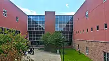 Northwestern is divided into four distinct "sub-schools": the A-Wing, B/G-Wing, C-Wing, and D/E/F-Wing.[5] Each can house between 600 and 700 students. The original plan was to physically divide the school into four smaller schools, hence the design theme of the building.[25] Sub-School A was intended to be the "School of Fine, Creative, and Performing Arts"; Sub-School B was to be the "School of Career and Consumer Education"; Sub-School C was to be a general facility that housed mainly elective courses, in addition the school's main offices, security office, and health center; and Sub-School D was to be "The School of Intensive and Specialized Instruction," which would house the school's honors and advanced placement program as well as the school's ESOL (English Speakers of Other Languages) program and Vocational Development (Special Education) program.[25] Students were not to be permitted to interact with students from other sub-schools,[25] and were to be isolated within their sub-school for the majority of the school day.[25] Due to scheduling conflicts and feasibility issues with this concept, the idea was dropped before the new building ever opened, while the idea of smaller learning communities was retained and revised to become less restrictive and isolating.