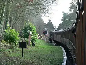 ![]() A train going through Northwood Halt, with the level crossing visible | |