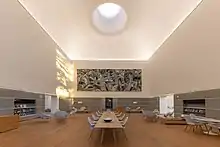 In 2001, the Norton Museum of Art underwent a significant expansion when the 45,000-square-foot (4,200 m2) Gail and Melvin Nessel Wing was built and increased the size of the museum to 122,500 square feet (11,380 m2). Constructed over two years, it was opened to the public in 2003. The expansion created more space to display art in both the new and existing areas, increasing the Norton's gallery space by 75 percent, allowing more opportunities for the museum's permanent collection. The wing includes 14 new galleries, an enclosed courtyard to accommodate a variety of educational and social events, a glass ceiling installation commissioned from Dale Chihuly, a cantilevered spiral staircase, and three-story atrium designed to evoke the museum's art. The J. Ira and Nicki Harris Family Pavilion is a wedge-shaped meeting and reception space off to one side.[1] The new wing was designed by Chad Floyd of the Connecticut-based Centerbrook Architects & Planners.