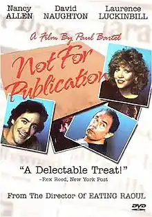 Not for Publication is a 1984 screwball comedy film directed by Paul Bartel and starring Nancy Allen. It premiered at the 1985 Sundance Film Festival before being acquired for distribution by Thorn EMI Screen Entertainment.[3] David Naughton, Laurence Luckinbill, Alan Rosenberg, and Alice Ghostley also appear.[4]
