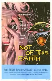 Not of This Earth is an independently made 1957 American black-and-white science fiction film produced and directed by Roger Corman (for his Los Altos Productions), that stars Paul Birch, Beverly Garland, Morgan Jones, William Roerick, and Anna Lee Carroll. The film was written by Charles B. Griffith and Mark Hanna and was distributed by Allied Artists Pictures Corporation as a double feature with Attack of the Crab Monsters.[2] Its theatrical release had a running time of 67 minutes, that was expanded to 70 minutes in 1962 for TV syndication.