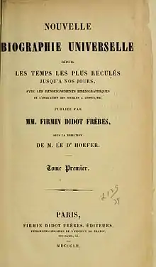 1. Its full title was Nouvelle Biographie Générale, depuis les temps les plus reculés jusqu'a nos jours, avec les renseignements bibliographiques et l'indication des sources a consulter ("New General Biography, from earliest times to the present, with bibliographic information and details of sources to consult").