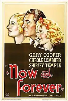 Now and Forever is a 1934 American drama film directed by Henry Hathaway. The screenplay by Vincent Lawrence and Sylvia Thalberg was based on the story "Honor Bright" by Jack Kirkland and Melville Baker.[1] The film stars Gary Cooper, Carole Lombard, and Shirley Temple in a story about a small-time swindler going straight for his child's sake. Temple sang "The World Owes Me a Living". The film was critically well received. Temple adored Cooper, who nicknamed her 'Wigglebritches'.[2] This is the only film in which Lombard and Temple appeared together.