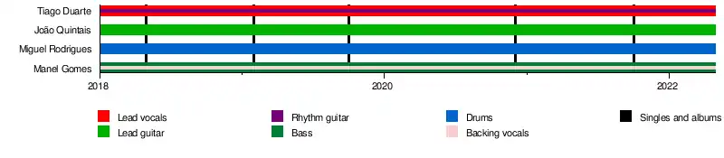 - Tiago Duarte – lead vocals and rhythm guitar (2018–present)